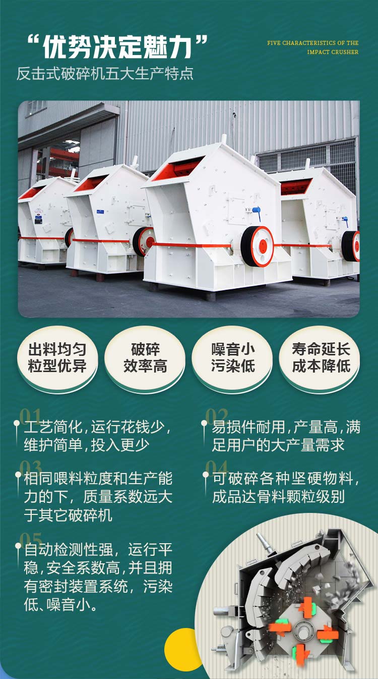 反擊式破碎機以新穎的設(shè)計原理為基礎(chǔ),采用新概念破碎技術(shù),能夠適應(yīng)不同規(guī)格物料的破碎,完全滿足“多碎少磨”新工藝的要求。“石打鐵”原理的運用使反擊式破碎機不僅破碎比大,而且單位耗電低,是一種真正效率高節(jié)能的破碎設(shè)備,同時長期實踐及大型工程也證明了反擊式破碎機在礦物加工具有良好的應(yīng)用前景,具有選擇性破碎作用,并且破碎產(chǎn)品粒度較均勻,形狀多數(shù)為立方體石子,在橋梁建造、高速筑路、 碼頭、機場建造等中有廣泛的應(yīng)用。