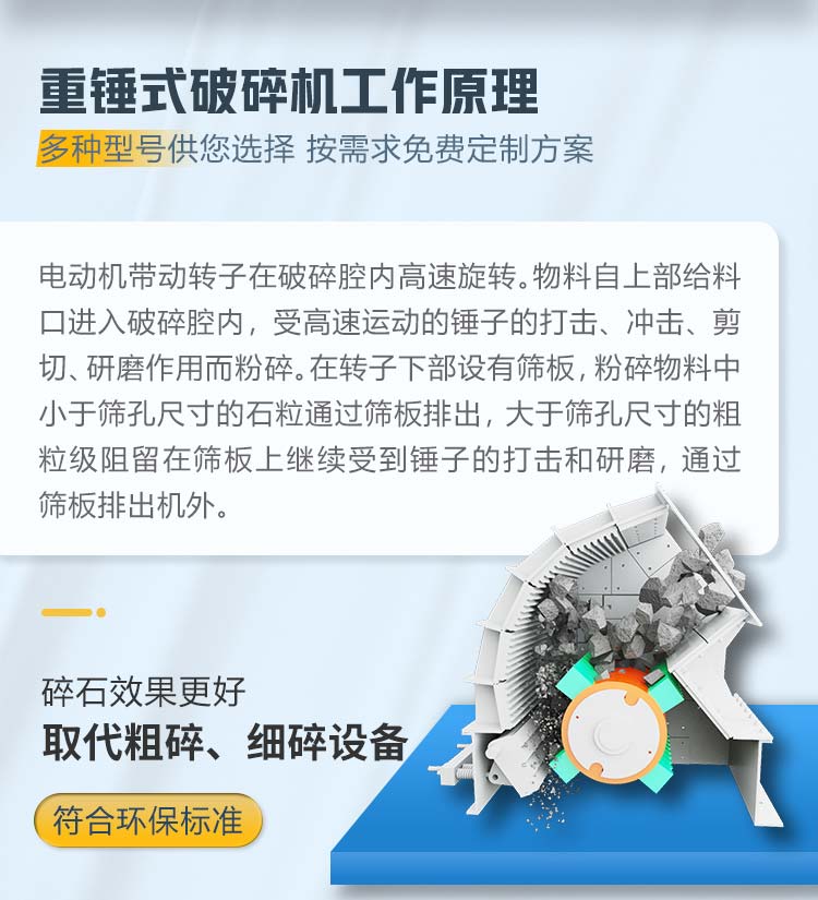 重錘式破碎機(jī)是破碎設(shè)備中的一種,也是目前行業(yè)內(nèi)錘式破碎機(jī)系列中技術(shù)比較先進(jìn)的一種設(shè)備,采用先進(jìn)的生產(chǎn)技術(shù),實(shí)現(xiàn)一次投料成型,具有效率高、節(jié)能環(huán)保之特點(diǎn)。